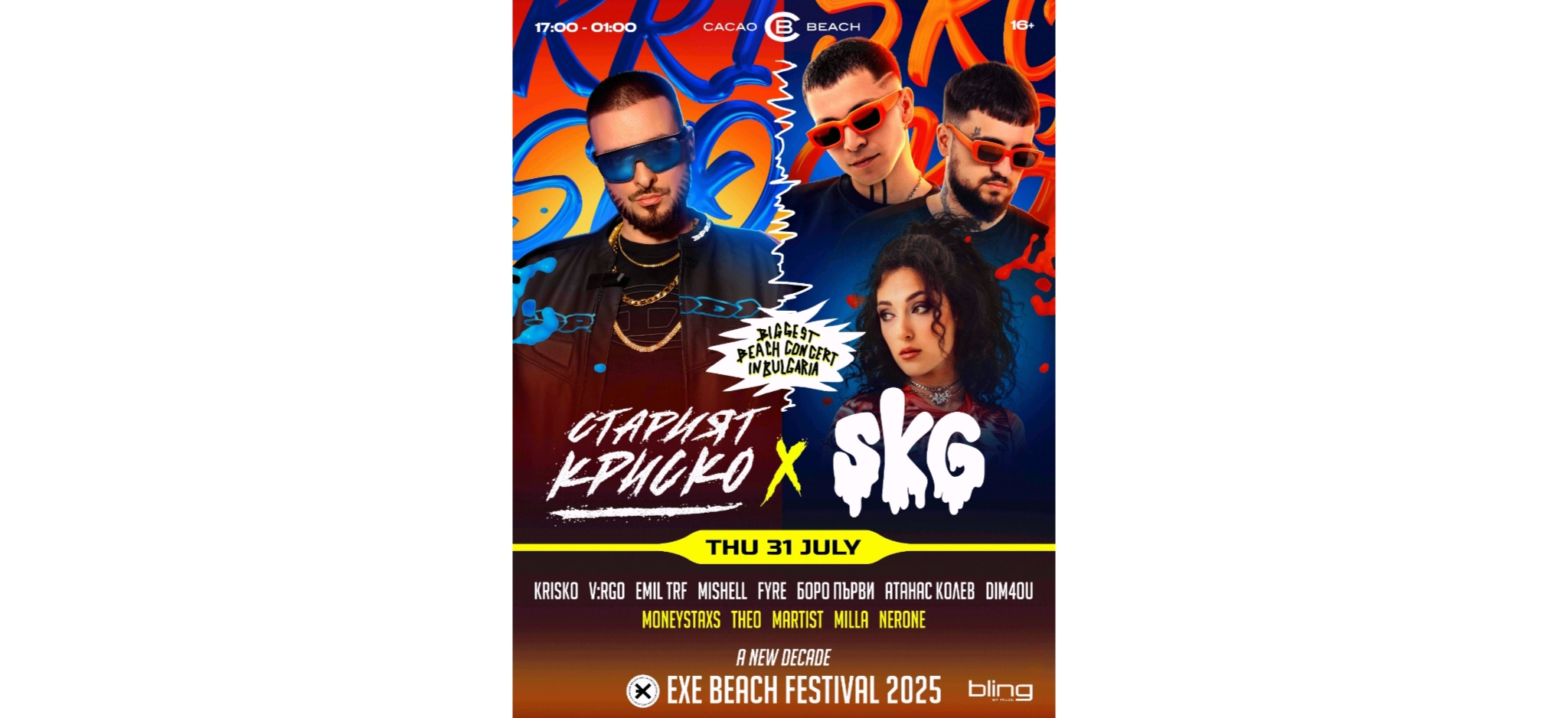 Това лято българският хип-хоп излиза извън рамките на клубовете и превзема една от най-емблематичните локации на Черноморието. На 31 юли, в сърцето на Cacao Beach, ще се проведе СТАРИЯТ КРИСКО x SKG || EXE BEACH FESTIVAL – най-мащабното плажно хип-хоп събитие в страната и зрелищна кулминация на проекта “Старият Криско”.