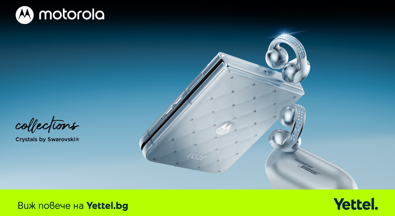 Елегантният Motorola Razr 60 5G с кристали Swarovski в комплект с Moto Buds Loop се предлага ексклузивно в онлайн магазина на Yettel
